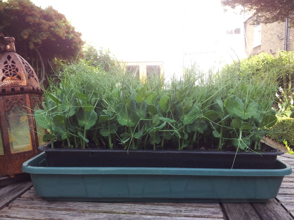 Thickly sow the soaked peas on top. This is probably the only time I’ll ever say to thickly-sow – usually the rule is less is more. Cover with a very thin layer of soil and keep moist.