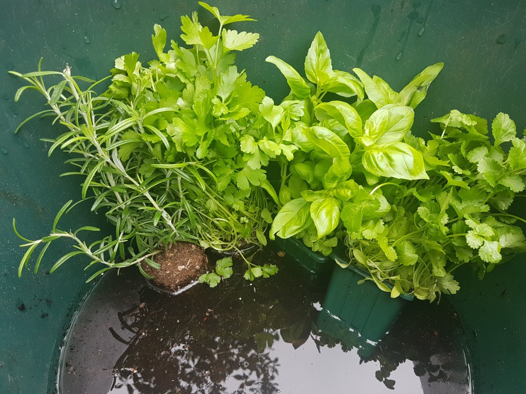 The poor rosemary and flat leaf parsley don’t even have pots. Their roots are sticking out and they are all bone dry.