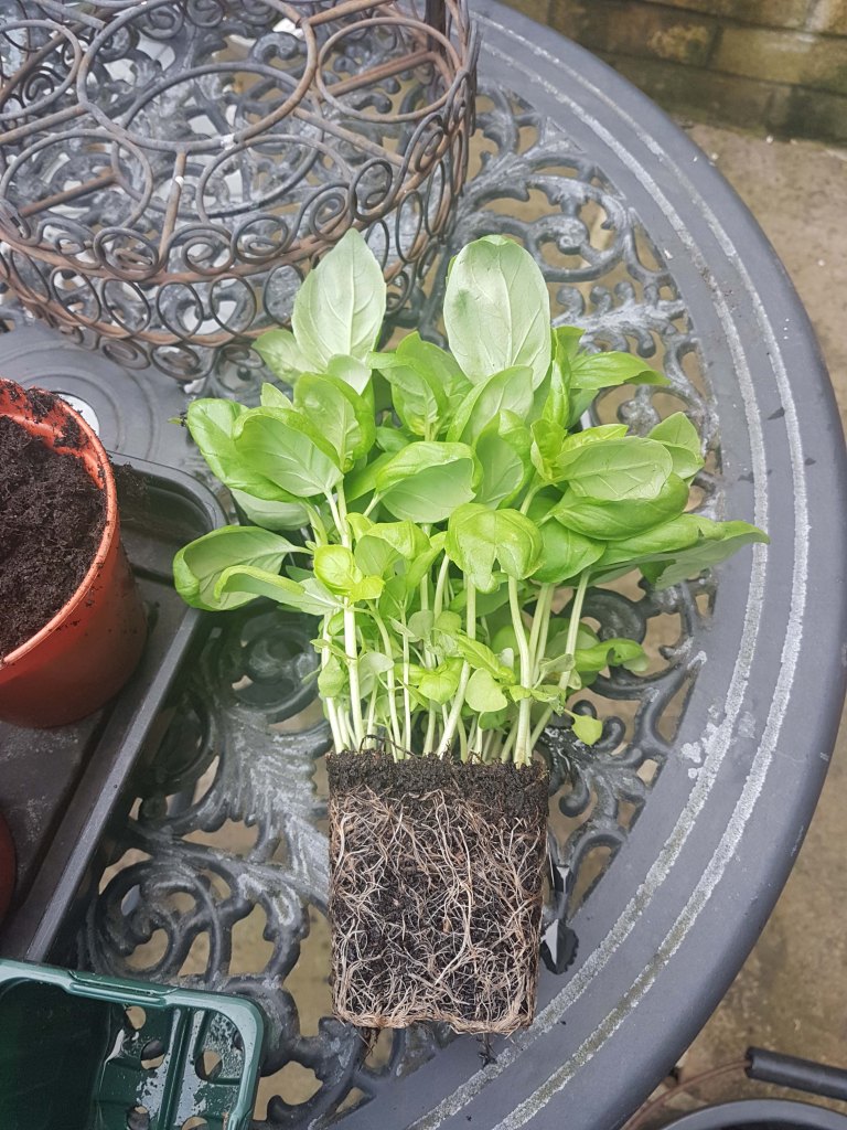 The reason why herbs like basil look so bushy is that these aren’t single plants. Each pot has about forty (no, really) seedlings, all sown together because seed is cheap, but all fighting for the same nutrients, light and water. If they stay like this they’ll die but it also means that we’ll get lots of decent plants out of one pot. They just won’t look so lavish – to start with.