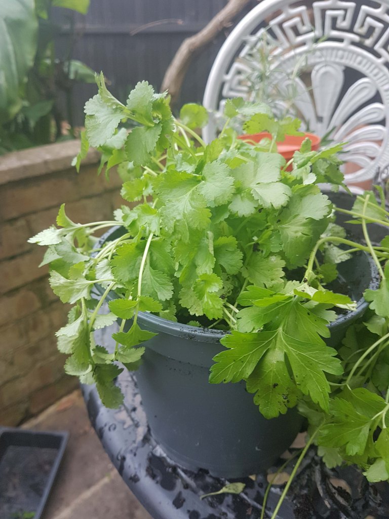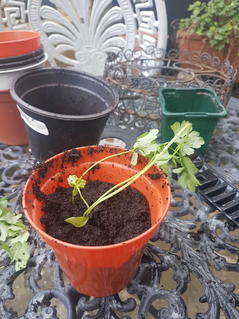 You can plant it out in the garden in April and it will keep going until the frosts. Ditto the coriander which, here, I’ve just put whole into a single, larger pot with refreshed compost for now: