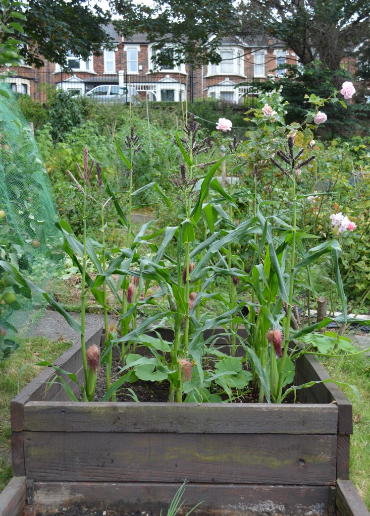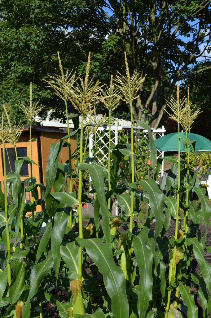 The three above are sometimes called the Three Sisters as, in South America they’re grown in the same plot of land. Sweetcorn grows tall, acting as a support for climbing beans. Pumpkins spread across the ground, shading the roots.