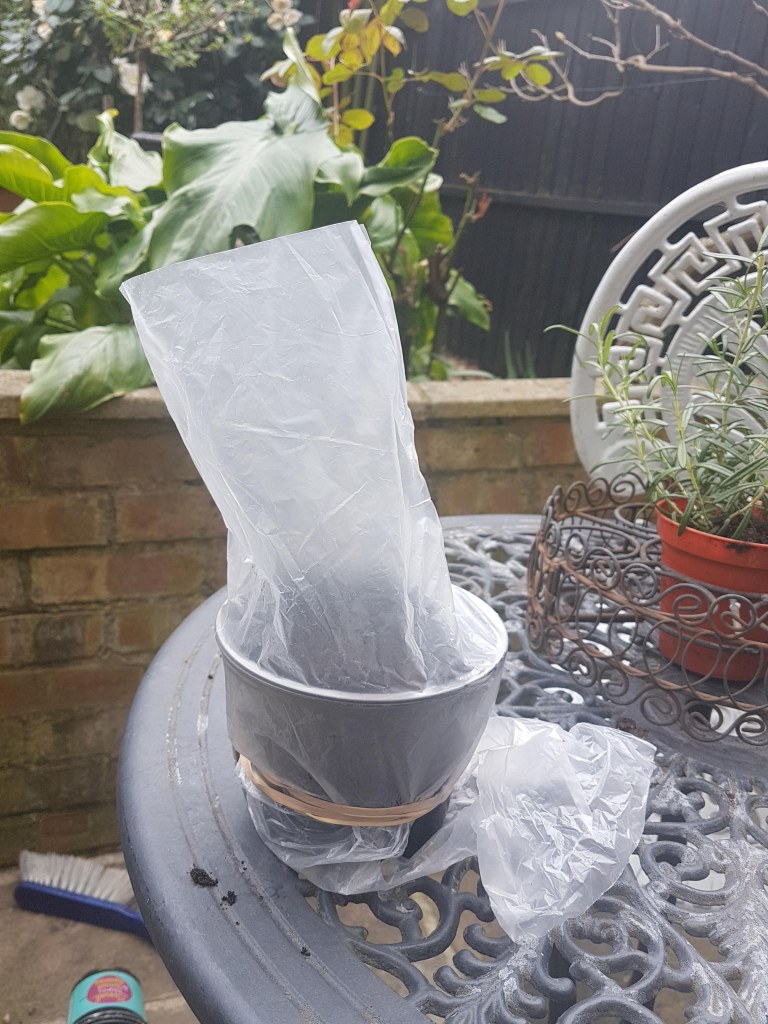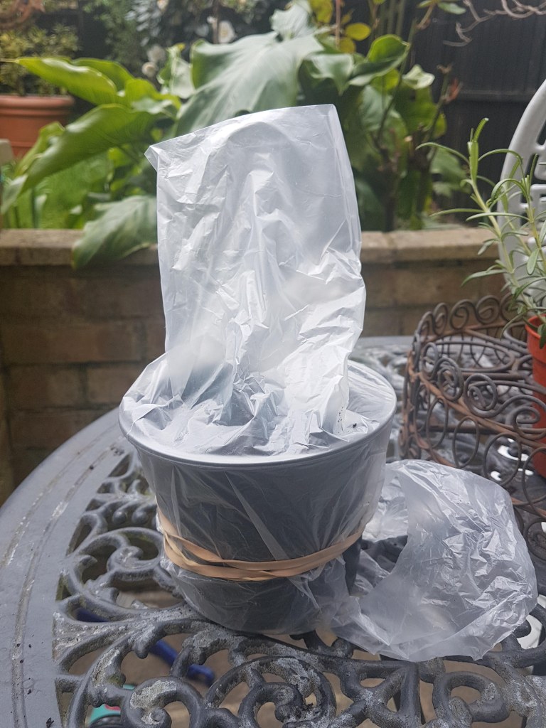 Get a clear or translucent sandwich bag (in this case I’m using a plant carrying bag) and put it upside down over the top of the pot