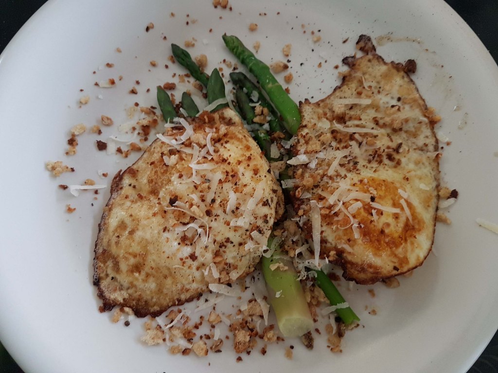 Asparagus with eggs and cheesy breadcrumbs.